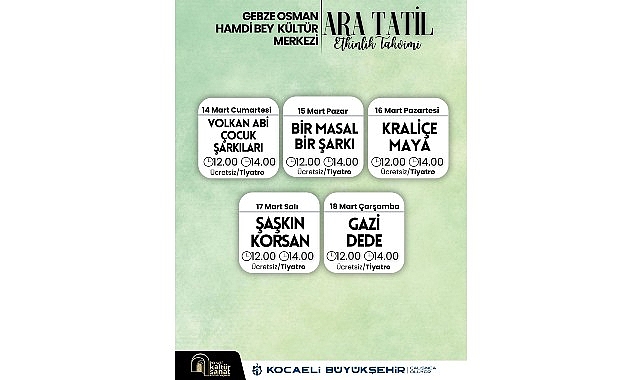 Kocaeli Büyükşehir’in ara tatil etkinlikleri iki seans halinde düzenlenecek. Sahne etkinlikleri 14,15, 16, 17 ve 18 Mart tarihlerinde, 12.00-14.00 saatlerinde yapılacak. Atölye çalışmaları ise 17-18 Mart tarihlerinde, 11.00-13.00 saatlerinde gerçekleştirilecek. 18 Mart Çarşamba gününe kadar devam edecek olan ara tatil etkinlik takvimi şöyle: