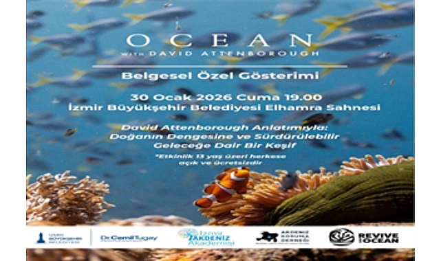 İzmir Büyükşehir Belediyesi, İzmir Akdeniz Akademisi ve Akdeniz Koruma Derneği iş birliğiyle, David Attenborough’nun anlatımıyla hazırlanan Ocean with David Attenborough belgeselini 30 Ocak 2026’da saat 19.00’da Elhamra Sahnesi'nde izleyicilerle buluşturuyor.