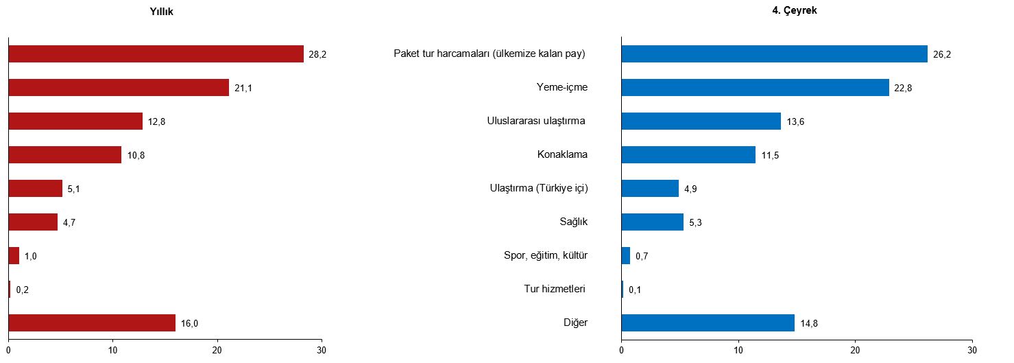 Bu çeyrekte ziyaretçilerden elde edilen turizm geliri içerisindeki paket tur harcamalarının payı %26,2, yeme içme harcamalarının payı %22,8, uluslararası ulaştırma harcamalarının payı ise %13,6 oldu. Bir önceki yılın aynı çeyreğine göre paket tur harcamaları %5,5, yeme içme harcamaları %20,8 ve uluslararası ulaştırma harcamaları %15,2 arttı.